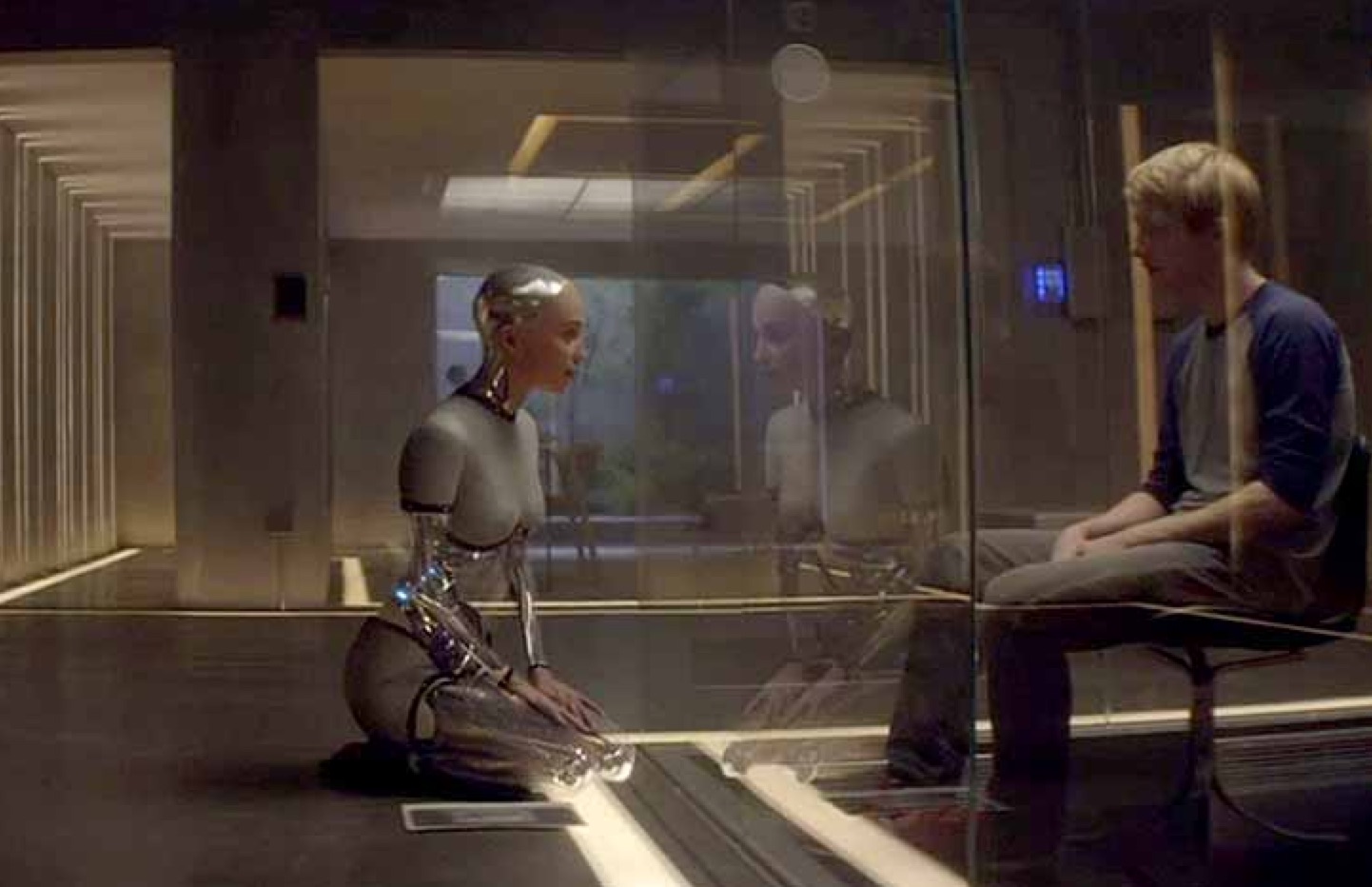 Nathan stages a series of daily conversations between Ava and Caleb, in which Ava is on one side of a glass wall and Caleb is on the other, as if he were visiting her in prison. Or a zoo.